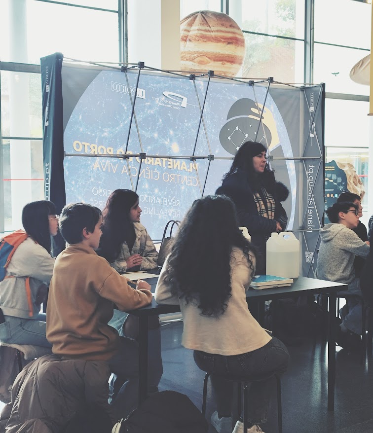 No Planetário do Porto, os alunos assistiram a uma apresentação educativa relacionada com o espaço e participaram numa atividade prática sobre a relação entre massa e peso, consolidando aprendizagens trabalhadas em sala de aula de forma dinâmica e experimental.