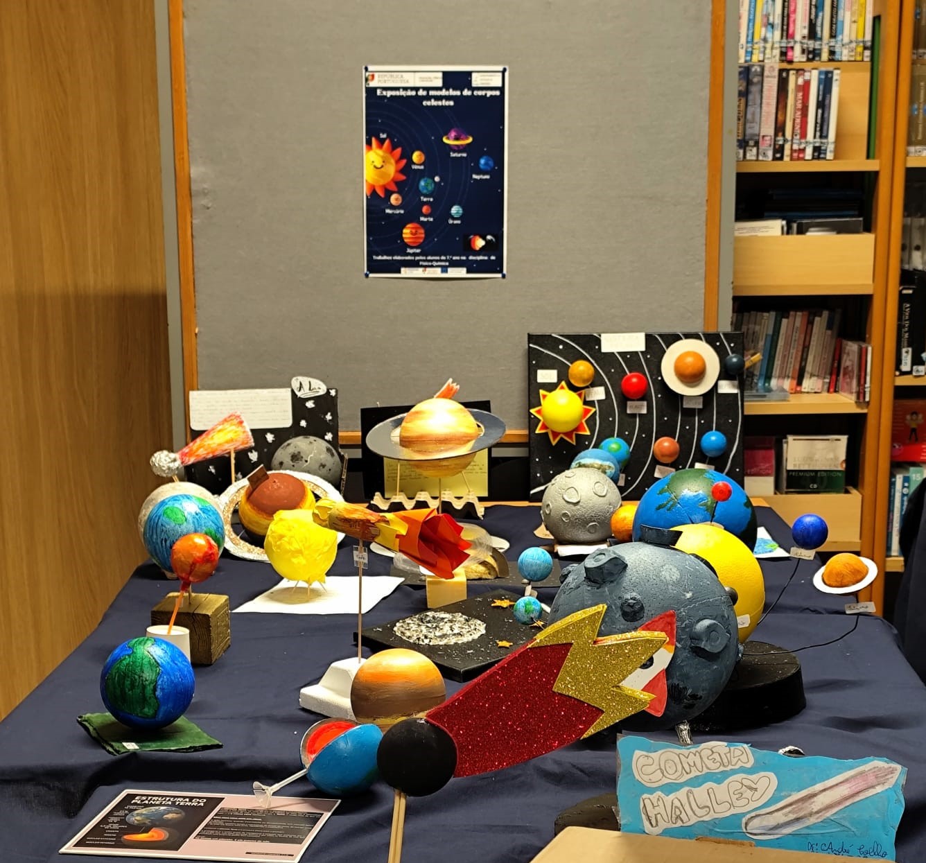 A biblioteca da escola acolhe, durante os próximos dias, uma exposição de modelos de corpos celestes realizados pelos alunos do 7.º Ano, no âmbito da disciplina de Físico-Química, desenvolvida no Domínio de Autonomia Curricular, subordinado ao tema “O Universo”.